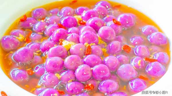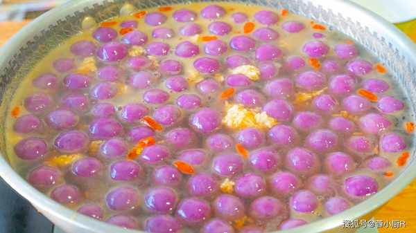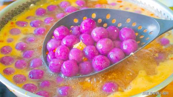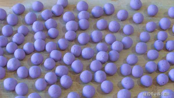 9、紫薯丸子的顏色是比較深的,想要顏色好看一點,可以加兩滴白醋或者是檸檬汁,這樣顏色就會變成帶點粉紅的感覺。紫薯富含花青素,而花青素是一種水溶性的天然色素,具有遇酸變紅、遇堿變藍的特性。