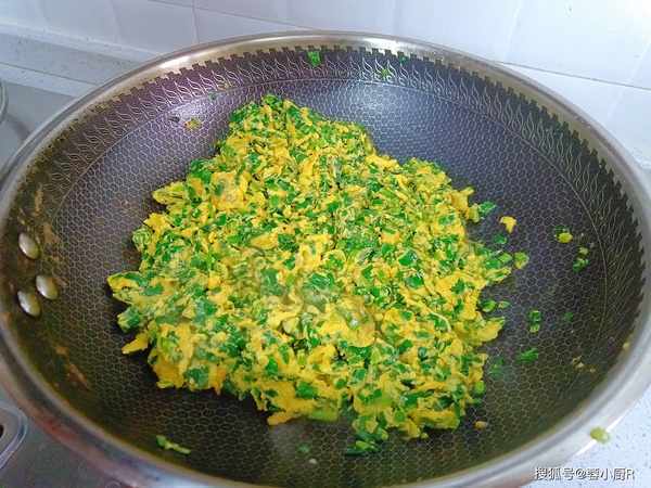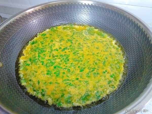 4、起鍋熱油,適量的多一點,比平常炒菜多一些就行,油熱倒入蛋液。