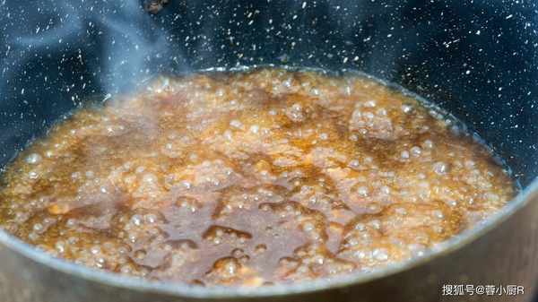 9、帶有山藥的那一份我們直接做,鍋燒熱後先把盤子裡面的湯汁都倒進來,然後再加2勺醬油、1勺生粉,中小火煮至冒泡後繼續熬成濃稠的醬汁,大概像這樣就可以瞭;