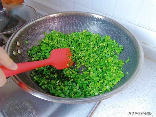 2、接著起鍋不用倒油,直接把韭菜倒進來炒,加一小勺鹽就夠瞭,其他的什麼都不用加,先把韭菜炒一下,味道會更香,同時也能把韭菜裡面的水分炒出來。韭菜炒軟後盛出來先放一旁備用。