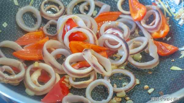 7、起鍋熱油,下蔥薑爆香,倒入紅辣椒爆炒。斷生後加魷魚圈一起繼續翻炒。