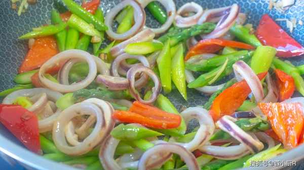大火翻炒均勻入味兒後就可以出鍋瞭,簡單又好吃的蘆筍魷魚圈就做好瞭。