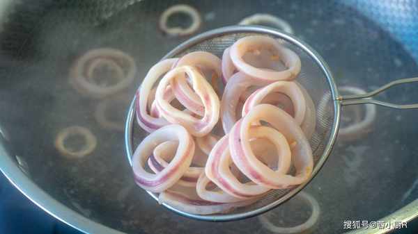 5、起鍋燒水,水開下魷魚圈焯水2分鐘,撈出來控幹水分備用。
