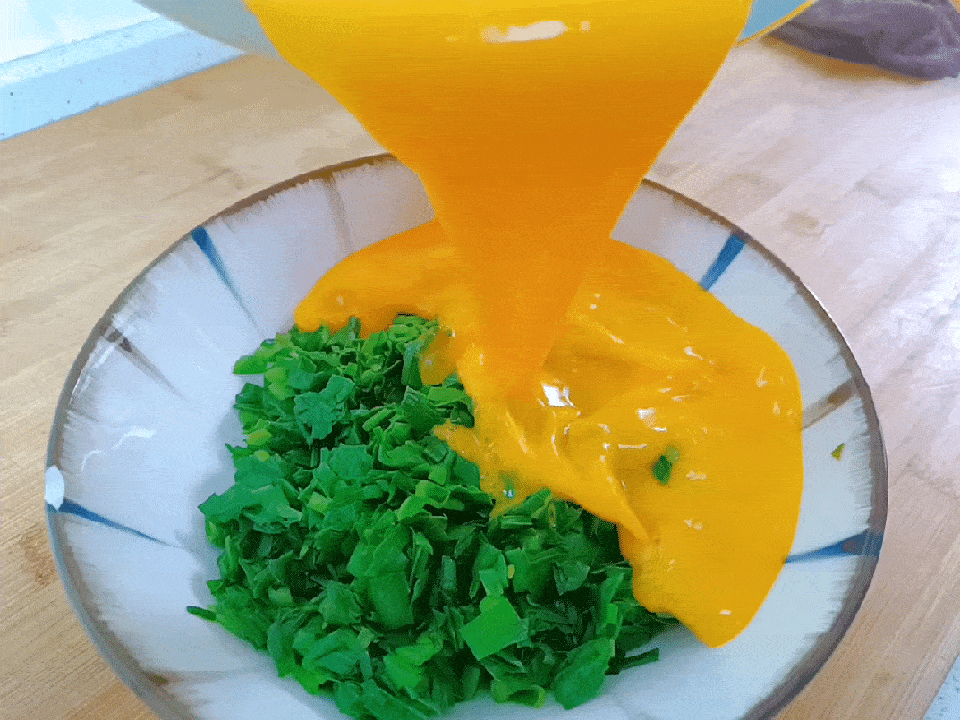 3、碗裡打入5個土雞蛋,加一勺鹽、半勺料酒和適量淀粉水後攪散備用。接著把蛋液倒入炒好的韭菜裡面,繼續攪拌均勻就可以瞭。