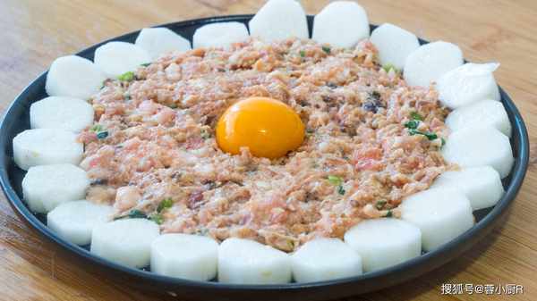 7、肉餡兒處理好後我們取一個蒸盤,先把山藥圍成一圈,然後在中間放上肉餡兒,稍微的整理一下並抹勻;接著在肉末的中間放上一顆蛋黃,團圓山藥蒸肉餅;