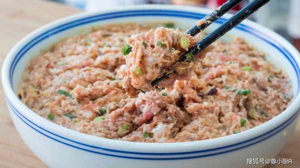 6、接著直接上手攪拌均勻並攪打上勁兒,打好的肉餡兒是這種發粘的狀態;