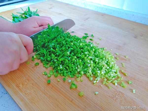 1、韭菜一把,擇掉發黃和爛瞭的葉子,然後在流動的清水下多沖洗幾遍。韭菜洗幹凈後晾幹水分,然後切成末備用。