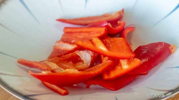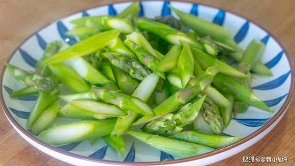 1、蘆筍300克去老根削皮,清洗幹凈後斜著切成小段。