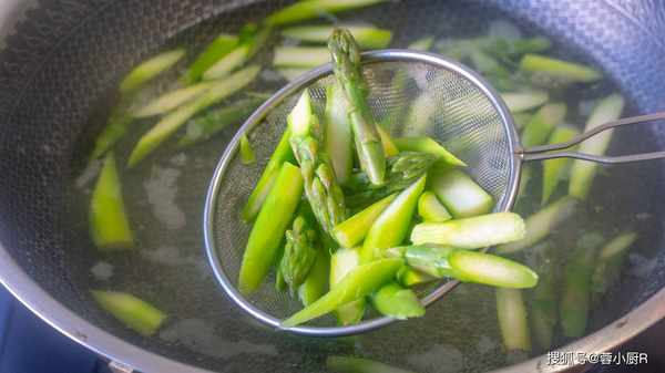 6、另外從新起鍋燒水,水開加一勺油和一勺鹽,倒入蘆筍焯水一分鐘,撈出來後先裝盤備用。