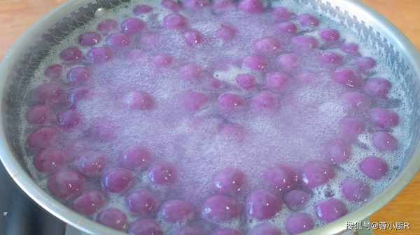 8、接著起鍋燒水,水開放入紫薯丸子煮,邊煮邊用鍋鏟輕輕地推動一下,避免粘鍋,煮到全部飄起來就熟瞭。
