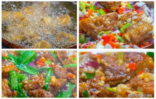 5、排骨醃制好瞭就來倒油,可以多倒一些,試一下油溫,六成熱下排骨炸,小火慢慢的炸,炸到每一塊排骨都變成金黃色,外皮還有一點焦焦的,就可以撈出來瞭。