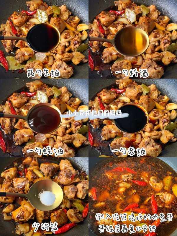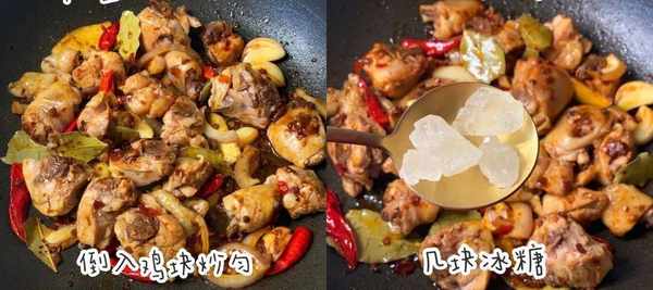 [2] 鍋中倒入雞塊炒勻,加入適量冰糖、2勺生抽、1勺料酒、1勺蠔油、1勺老抽、少許鹽。倒入沒過雞塊的清水,煮開後調最小火煮15分鐘。