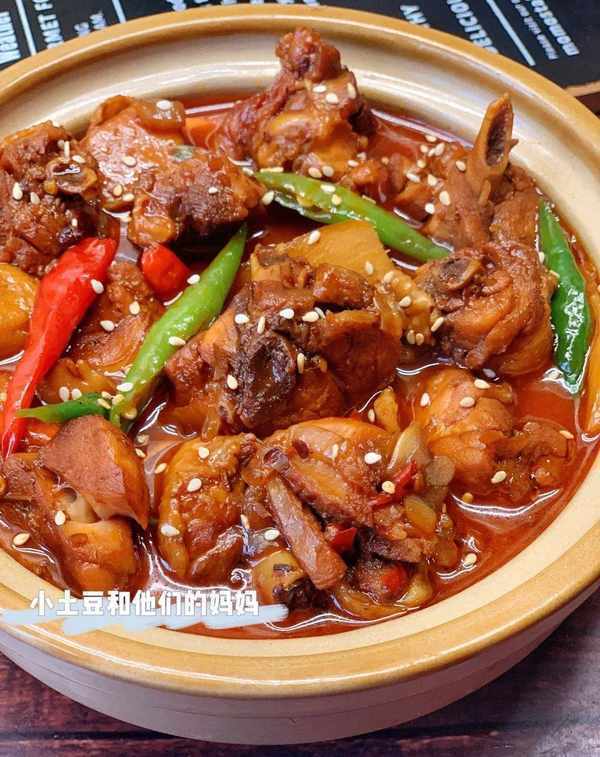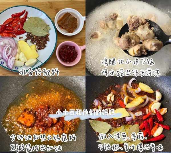 [1] 雞腿洗凈切塊下鍋焯水,撈出洗去浮沫。起鍋燒油放入火鍋底料和豆瓣醬炒出紅油,融化後倒入洋蔥、薑蒜、幹辣椒和香葉炒出香味。