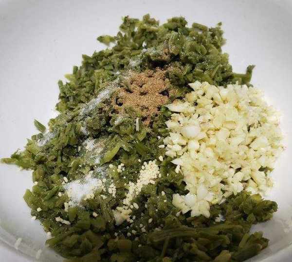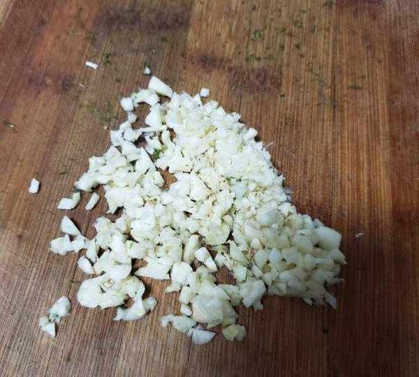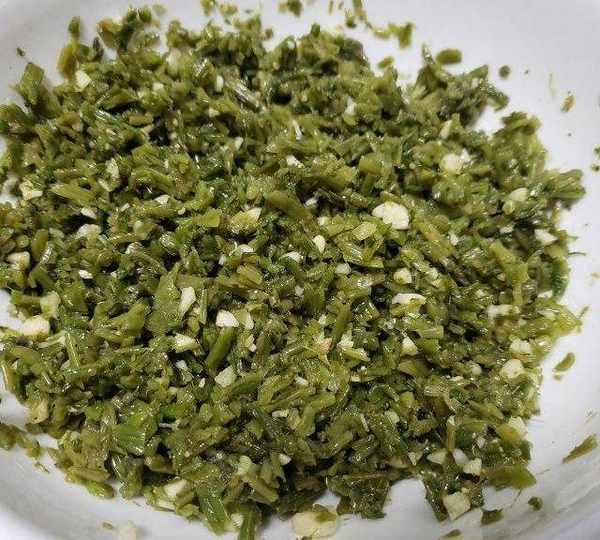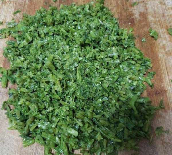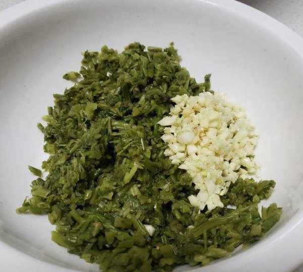 第1步、紅薯梗解凍,擠出多餘水分,剁碎,備用。