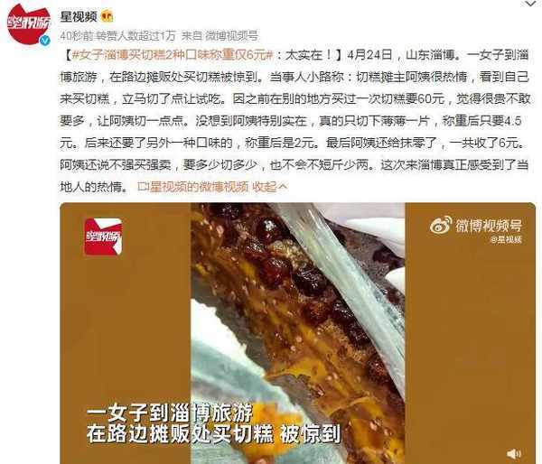 星視頻的分享顯示,4月24日,一女子到淄博旅遊,在路邊攤販處買切糕被驚到。當事人小路稱:切糕攤主阿姨很熱情,看到自己來買切糕,立馬切瞭點讓試吃。