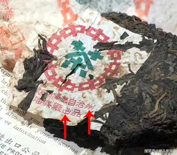 同時,“勐海茶廠出品”的“出”字,上山小、下山大,中間一豎突出,行話叫做“尖出”內飛。