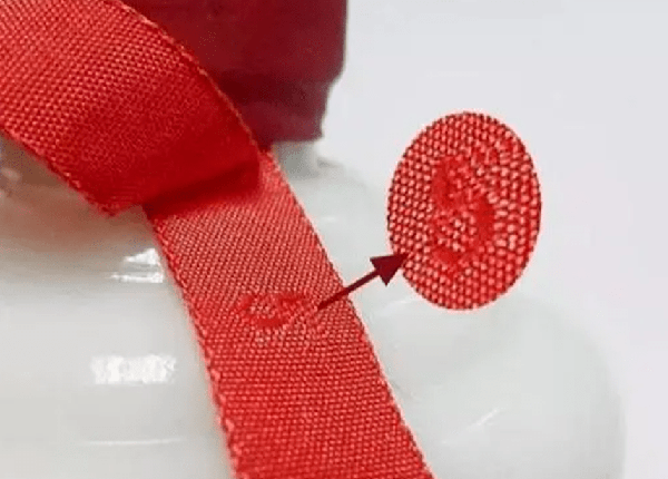 茅臺的絲帶顏色是中國紅色,染色均勻,材料也是非常精細的面料,感覺更光滑,有一定的紋理,假茅臺的絲帶一般比較粗糙,畢竟,為瞭降低成本。
