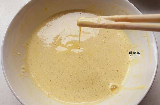 1、把紅薯粉用勺子壓碎,然後打入兩個雞蛋雞蛋攪勻,紅薯粉吸水性比較強,兩個雞蛋是沒有辦法稀釋紅薯粉的,還要再放30毫升左右的清水,然後攪拌至面糊可以掛住筷子就可以瞭。