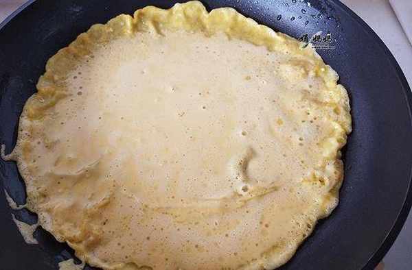 2、平底鍋裡倒適量油潤鍋,然後把面糊倒在鍋中均勻的晃動鍋靶,把面糊攤成一個面餅撈出來,100克紅薯粉和兩個雞蛋可以攤兩個。
