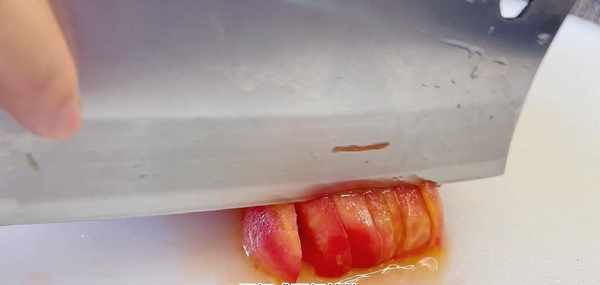 可以根據個人的喜好來選擇。切好之後放入盤中,這個時候西紅柿已經去好皮瞭,對半切開,去掉中間的硬梗,再把西紅柿先切成薄片,再切成西紅柿塊