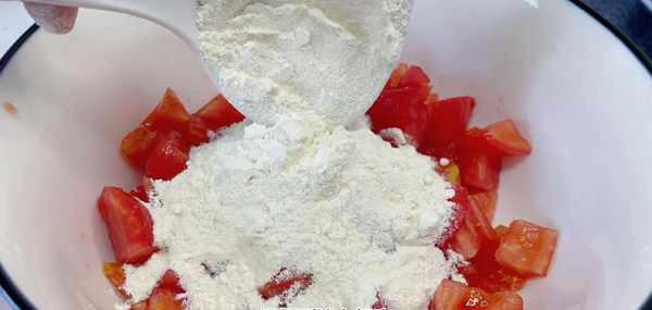 西紅柿切好之後,出在大碗裡面。這個時候我們往裡面加入兩勺面粉,面粉的量可以根據西紅柿的量隨意添加,加好之後攪拌均勻