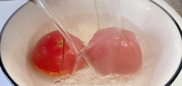一起來看一下我是怎樣制作的吧。首先我們準備兩個西紅柿,清洗幹凈,從頂部劃上十字花刀,全部處理好之後直接放在大碗裡面,再往裡面倒入熱水,把西紅柿燙一下,