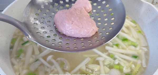 我們可以把海鮮菇放在最後加入,翻炒均勻之後再加入熱水,這裡一定要加入熱水,這個時候再準備上一個漏勺,把攪拌好的面糊舀在漏勺裡面,用鏟子不停的攪拌,像這樣一個大小均勻的小面疙瘩就出來瞭