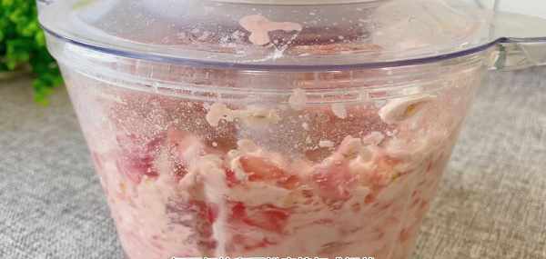 使每一塊西紅柿都沾上面粉。像這樣攪拌均勻之後,直接倒在絞肉機裡面,蓋上蓋子,把西紅柿和面粉直接打成糊狀,最後打成這種稍微比較粘稠的糊狀就可以啦