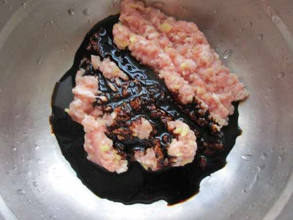 第四步:猪肉剁成肉餡,加入葱末薑末,醬油,鹽,花生油拌勻,蓮藕剁碎放入拌勻,餛飩餡即成。