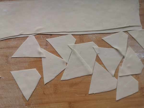 第三步:用刀先切成長條,再切成梯形的面片,這就是餛飩皮。如果自己不會做,也可以買現成的餛飩皮。為了家人吃的更健康,我一般都是自己擀制餛飩皮。