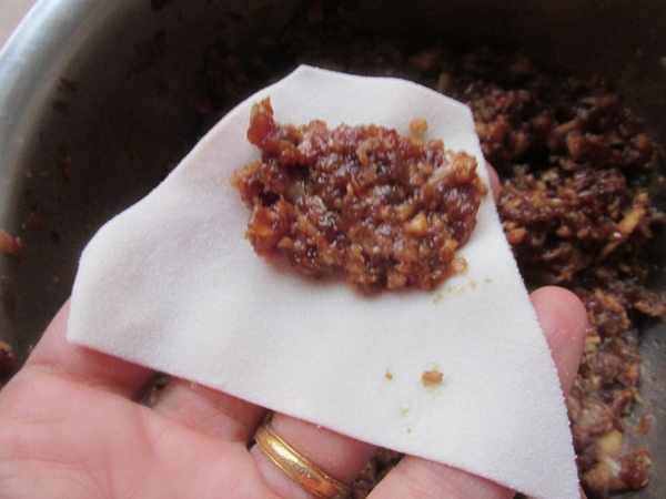 第五步:拿一個餛飩皮,放上肉餡,卷一下,對著捏緊即可。