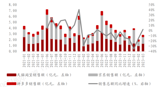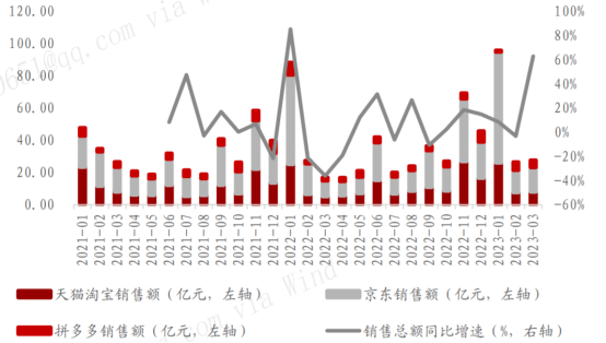 根據蘿卜投研數據,3月份白酒線上銷售額同比創新高,三大電商(淘系、京東、拼多多)線上銷售總額同比上升62.66%至27.55億元,增速創近一年新高。