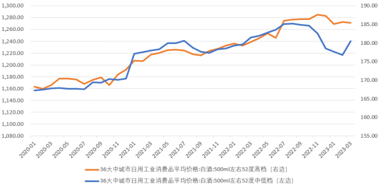 根據發改委發佈3月份36大中城市500ml白酒價格數據,其中高檔白酒平均價格為1271.59元/瓶,自2022年以來降低0.9%,同比增加2.65%;中低檔白酒均價格為180.52元/瓶,自2022年以來增加1.12%,同比降低0.53%。