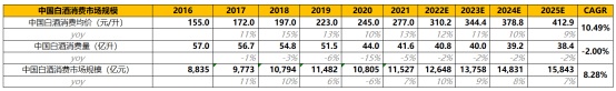 中國白酒消費均價預測——增長率從2021年的12%遞減至2025年的9%,至2025年提升至412.9元,2021~2025年CAGR為10.49%。