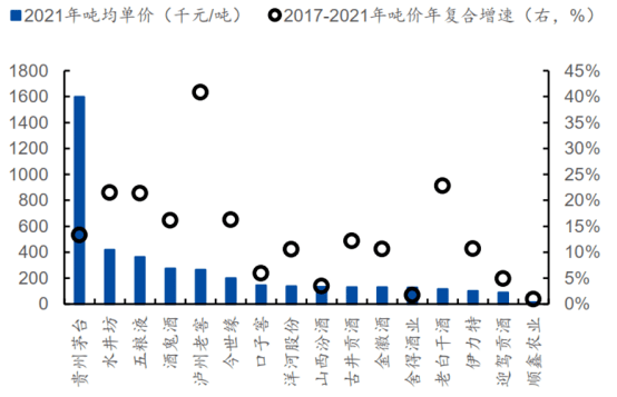 圖:主要上市白酒企業 2017-2021 年噸價及增速