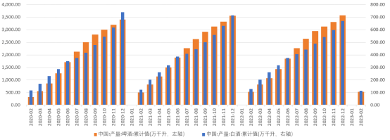 根據國傢統計局發佈的數據,2023年1-2月份白酒累計產量112.4萬千升,同比減少-11.22%;啤酒累計產量524.8萬千升,同比減少1.15%。