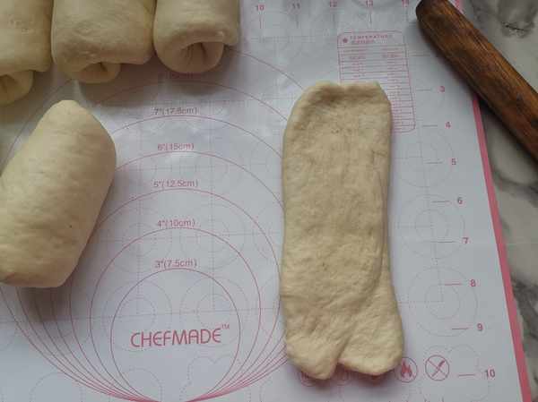 第四步:把小劑子按扁,用擀麵杖擀成長舌狀,卷起來,蓋上保鮮膜鬆弛五分鐘。