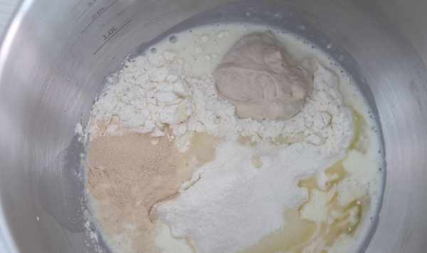 1高筋粉、牛奶、蛋液、細砂糖、酵母粉以及法式老面,一起放入和面缸裡。