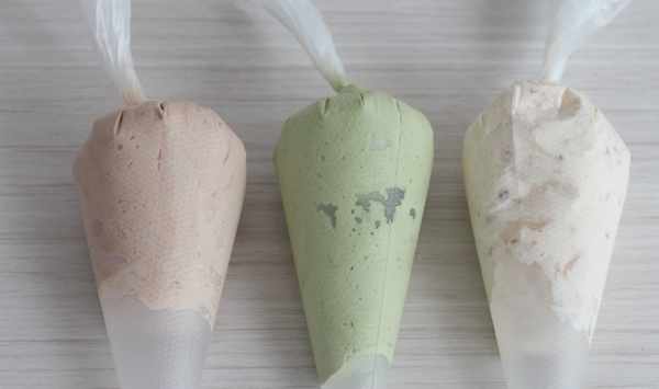 夾餡:淡奶油280克、細砂糖20克、草莓醬適量、抹茶粉少許、可可粉少許