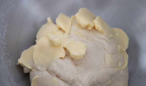 3加入提前軟化好的黃油,用低速攪打到黃油完全被面團吸收。