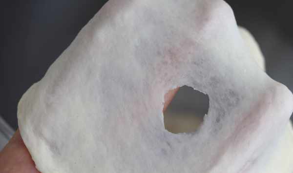 2低速混合成團後,轉中高速攪打,面團變得光滑有彈性,能抻出較厚的膜,破口處的邊緣可以看到明顯的鋸齒狀。