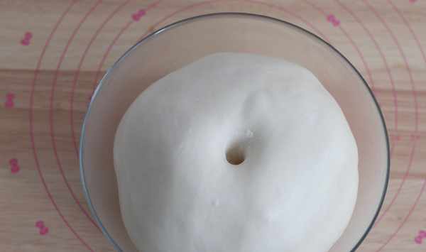 5面團裝入容器,蓋上保鮮膜,放置在28度左右的溫暖環境裡發酵至2倍大,手指蘸取少許幹粉,在面團的表面戳一個洞,面團也沒有塌陷,洞口沒有立刻回彈,即基礎發酵完成。