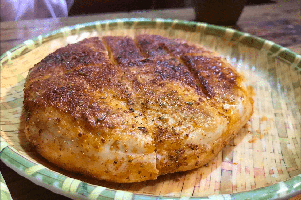 我們在吃烤串的時候,還點瞭2個馕,這個也是他們的特色,把馕成幾小塊,然後放入燒烤架上,再涮上一些調料,烤制金黃的時候,然後既可以吃瞭,非常的酥脆。