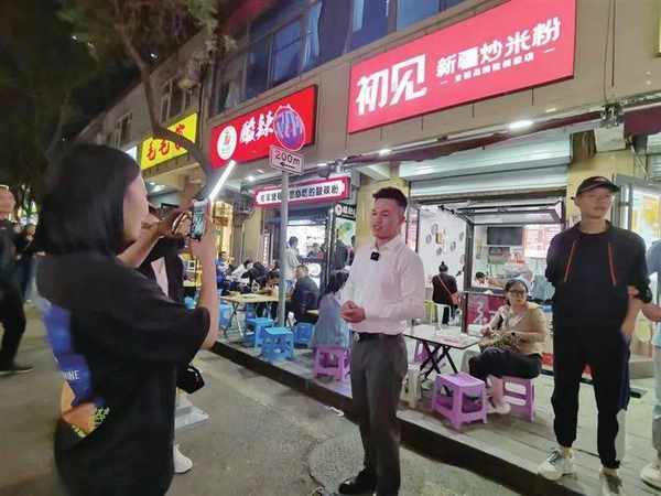 “初見新疆炒米粉”店前,店傢正在錄制推廣的小視頻