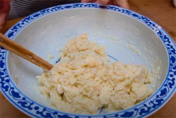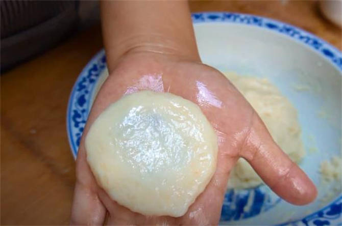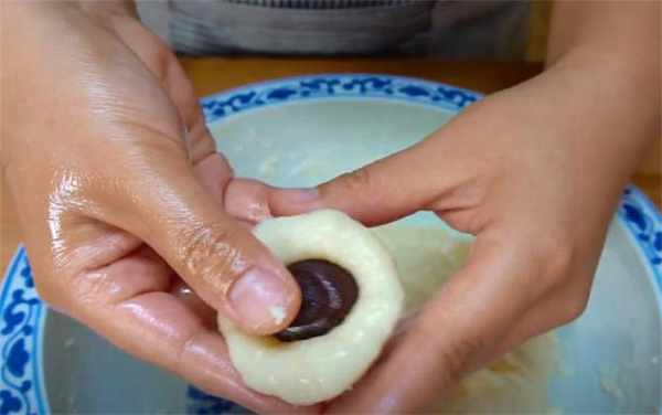 2.晾涼之後表面澆一些油,揉一下揉勻,掌心再塗抹一些油或者水防粘,揪取一小塊面團,在掌心團一下,中間按一個洞,放一個豆沙餡或者是包著白糖,收口處捏緊。