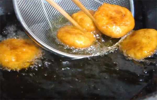 4.油溫六成熱下鍋,下鍋之後先不要接著翻面,等稍微定型之後用筷子撥動兩下,防止粘鍋,翻個面,炸到兩面金黃浮起出鍋。