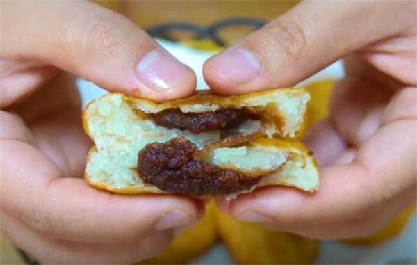 5.做好的油炸糕特別的柔軟,我們掰開一個,看看裡面這個餡,這個餡可以換成自己喜歡的,換成白糖也行。
