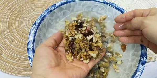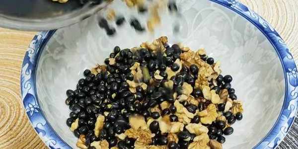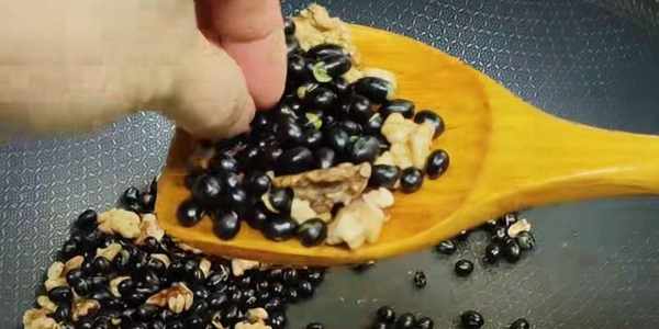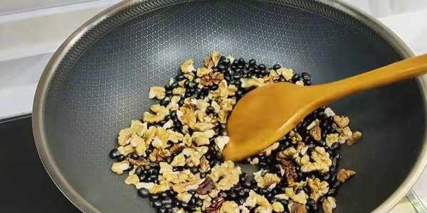先來炒黑豆,小火慢炒,炒至有香味裂口時倒入核桃仁一起翻炒,核桃仁很好炒熟,炒制時捏一個黑豆嘗嘗,沒有豆腥味,口感很香就說明熟瞭。