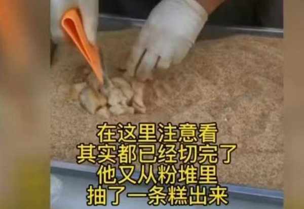 隻見攤主很是嫻熟地從果粉裡扒拉出一段打糕混入其中繼續切,切瞭一段還不算,又扒拉出一段來切,隨後將這些全部一起混入裹粉。攤主以為自己做的天衣無縫,卻沒想到全被女子拍瞭下來。