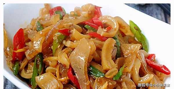 9、將豬皮和肉絲倒入鍋中,翻炒片刻,倒入少許醬油上色。